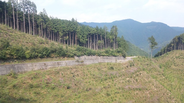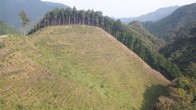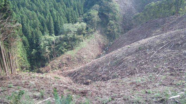 伐採直後と植林済の斜面。