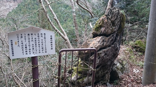 弁慶の腕ぬき岩に腕を通し、