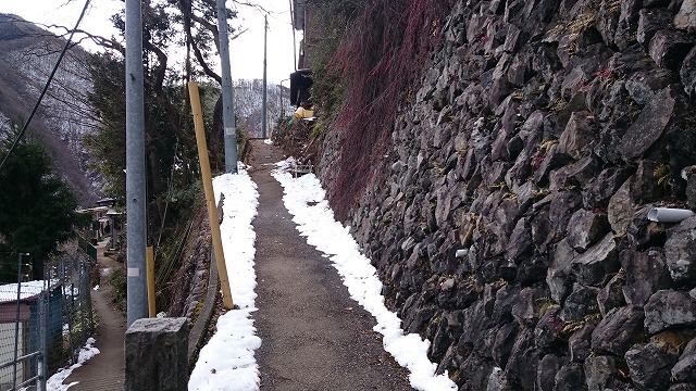 奥多摩湖に近づくと、民家横の細い道を