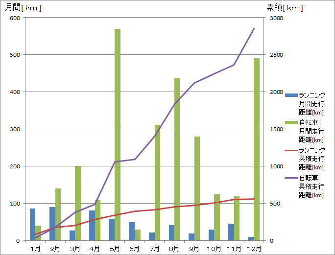 紫折れ線 自転車 累積走行 [km] (右軸)