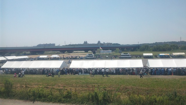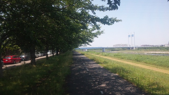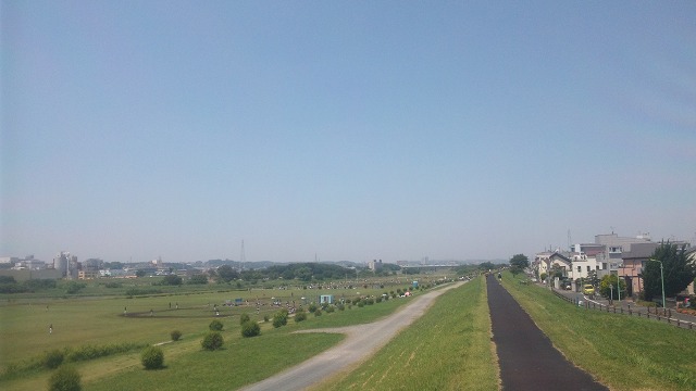 曇り空の中、多摩川土手を