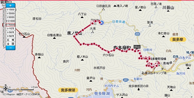 奥多摩方面約16km、6時間20分の